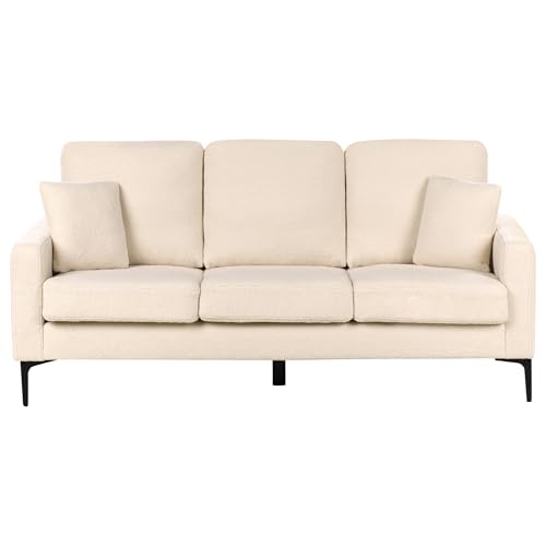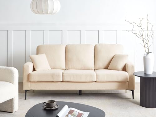 Beiges Sofa jeder Bouclé mit zusätzlichen Kissen. Ein Polstersofa für sämtliche Ihre Gäste. Die Couch ist mit einem weichen, luxuriösen Bouclé-Stoff gepolstert und verfügt über alles erlaubend gepolsterte Sitz- und Rückenkissen, die ultimativen Sitzkomfort garantieren. Zusätzliche Kissen sehen nach noch mehr Komfort und lassen sich dank den abnehmbaren Bezügen leicht reinigen. Das elegante, schlichte Design des Bouclé-Sofas wird durch die schwarzen Metallbeine unterstrichen. So wirkt das Modell sehr einladend in minimalistischen Räumen und Lofts.