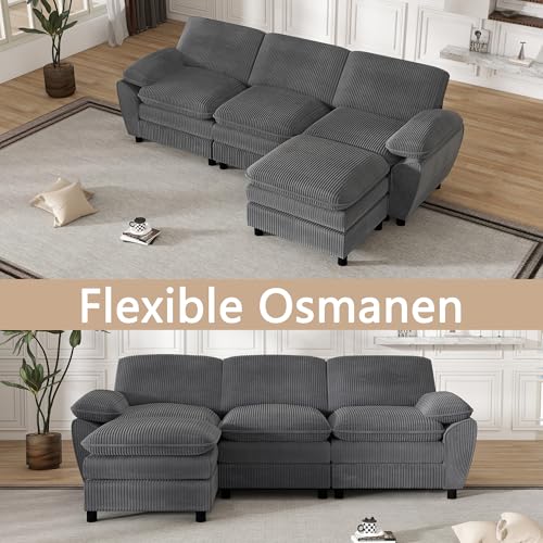 Arhatreya 3 Sitzer Sofa Gästesofa Couch, 3er Modulares Sitzsofa mit Hocker, Polstersofa für Wohnzimmer, Schlafzimmer, Wohnung, Gästezimmer, Cordstoff, Grau