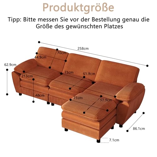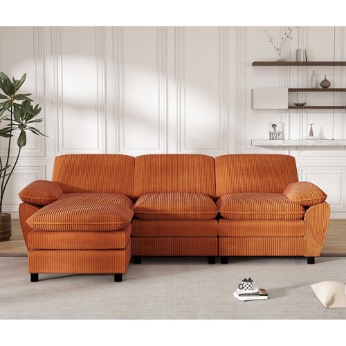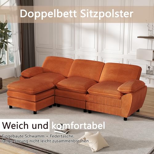 Arhatreya 3 Sitzer Sofa Gästesofa Couch, 3er Modulares Sitzsofa mit Hocker, Polstersofa für Wohnzimmer, Schlafzimmer, Wohnung, Gästezimmer, Cordstoff, Orange