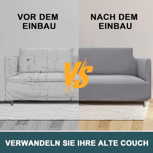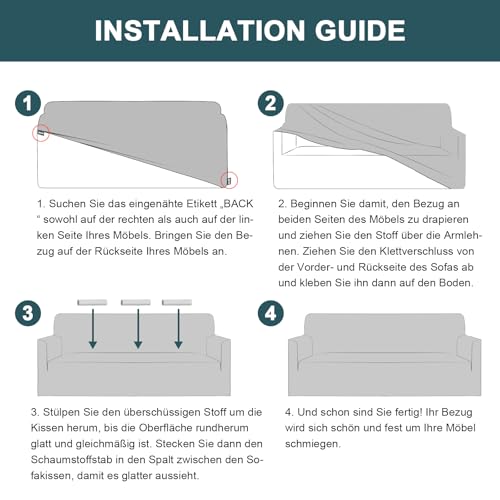 【EINFACHE INSTALLATION】: Legen Sie den sofaschoner einfach auf Ihr Möbelstück, stopfen Sie überschüssigen Stoff verschütt gegangen, ziehen Sie die Bänder nieder fest und stecken Sie die Schaumstoffstäbe in die Lücke zwischen der Rückenlehne und der Sitzfläche für ein nahtloses Aussehen. Der elastische Boden sorgt dafür, dass der Bezug fest an seinem Platz bleibt.