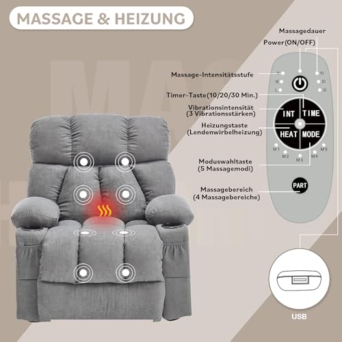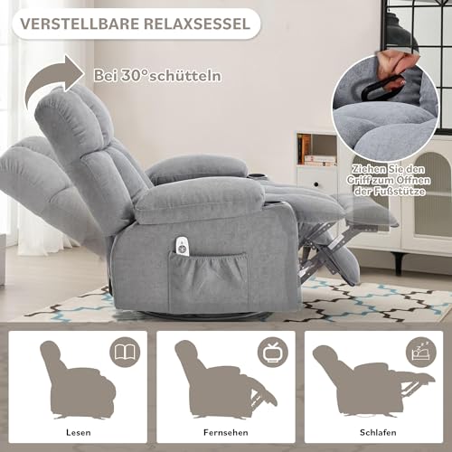 Bosmiller Relaxsessel Elektrisch Massagesessel mit Heizung Für Erwachsene, Fernsehsessel Relaxstuhl mit Liegefunktion,Aus Stoff TV-Sessel mit 360°-Drehung für Wohnzimmer,Grau