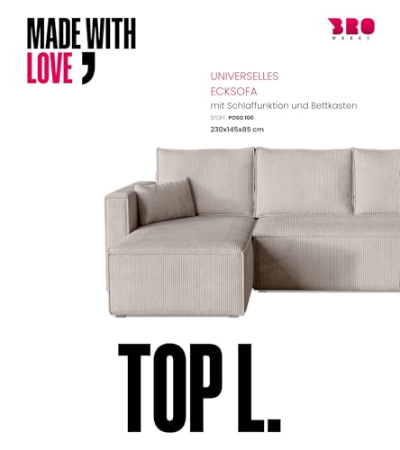 Bettkasten unter dem Sitz – Das Ecksofa verfügt über einen praktischen Bettkasten, der zusätzlichen Stauraum für Decken, Kissen und mehr bietet. So bleibt Ihr Wohnzimmer adrett und organisiert, ohne auf zusätzlichen Platz verzichten zu müssen.