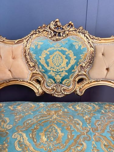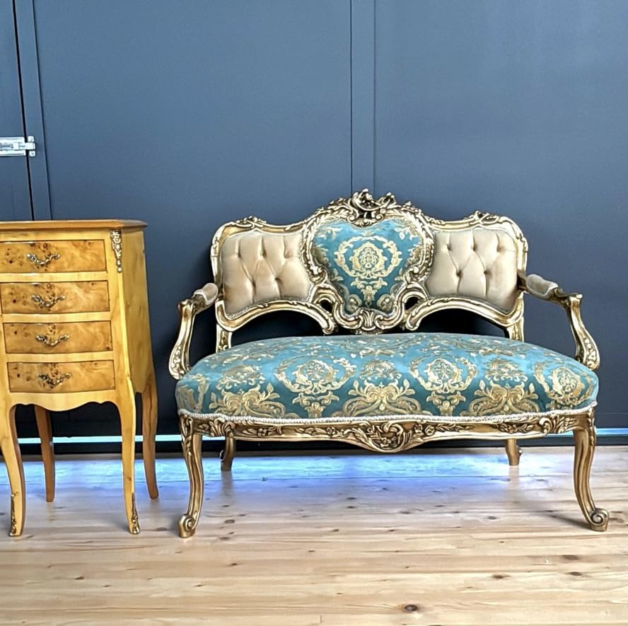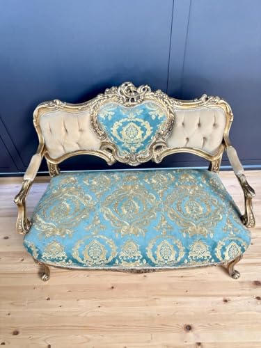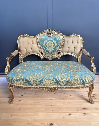 CasAmin Home & Living Französisches Barocksofa, 2-Sitzer in Glänzendem Blau und Kamel Samt, Handgefertigtes Sofa im Nostalgischen Rokoko Stil für die Wohnzimmerdekoration