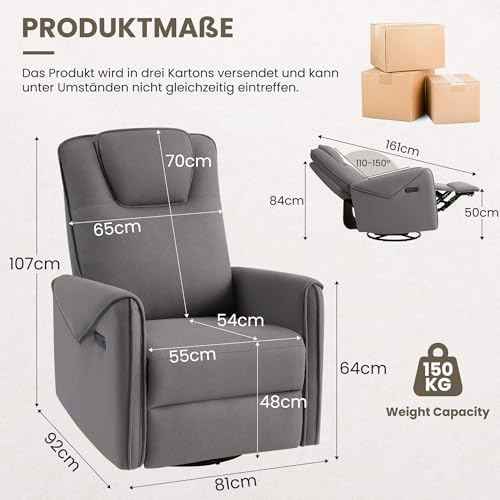 3-in-1 Liegesessel & Schaukelsessel: Mit einfacher Knopfdrosselung und robustem Stahlrahmen bietet diese Elektrisch Fernsehsessel mit Liegefunktion maximale Sicherheit und Zuverlässigkeit. Genießen Sie eine 270° Drehbarkeit, sanftes Schwingen bis zu 30° und eine verstellbare Liegeposition (Rücken 110°-150°, Fußstütze 0°-90°), wobei jeder Winkel individuell fixiert werden kann. Unsere Liegestühle zu Ende führen alle Ihre Bedürfnisse und ist perfekt im Rahmen für entspannte Stunden oder gemütliche Abende