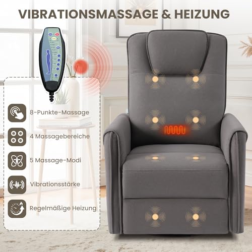 Massage und Heizung: Diese relaxsessel mit liegefunktion verfügt über acht vibrierende Massagepunkte in vier wichtigen Körperbereichen, fünf verschiedene Massagemodule und zwei Intensitätsstufen, um ein individuelles Entspannungserlebnis zu bieten. Integrierte Taillenheizung: Präzise Temperatureinstellung und automatisches Abschalten des Timers für, einfach über eine Fernbedienung bedienbar