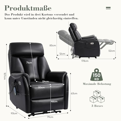 Consofa Fernsehsessel Elektrisch Verstellbar, Relaxsessel Massagesessel mit Wärmefunktion Liegefunktion,2 Seitentaschen,Schnürsenkel,Typ C & USB-AnschlüSse,TV Sessel für Wohnzimmer (PU, Schwarz)