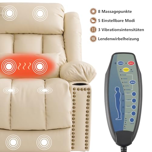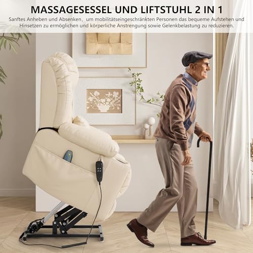 VERBESSERTE MASSAGE & HEIZUNG: Der elektrische Aufstehsessel verfügt über 8 Vibrationspunkte, die Rücken, Lendenbereich, Oberschenkel und Beine anreden. Mit 5 Vibrationsmassage-Modi und 3 Intensitätsstufen bietet er ein personalisiertes Ganzkörpermassage-Erlebnis für zu Hause. Die Lendenheizfunktion hilft, Müdigkeit zu abspecken, indem sie den Ausgabe abbaut und die Blutzirkulation im Lendenbereich fördert.
