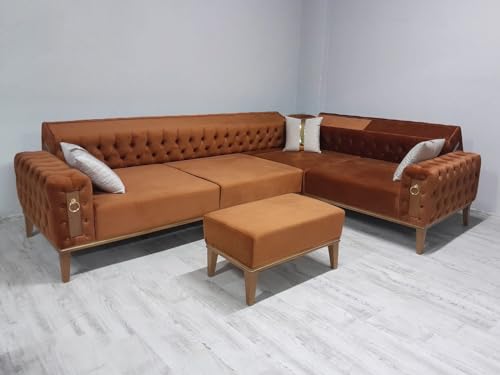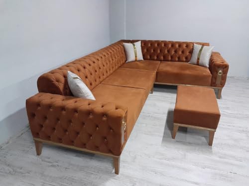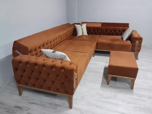 Luxus: Edles Design und goldene Akzente verleihen dem Sofa einen Hauch von Luxus. · Zubehör: Enthält passenden Polsterhocker und drei dekorative Kissen für zusätzlichen Komfort. · Farbvielfalt: Breite Auswahl an Farboptionen für individuelle Abart an den Einrichtungsstil. · Gesamtkunstwerk: Harmonisches Design, höchster Sitzkomfort für ästhetisches Gesamtkunstwerk. · Vielseitig: Flexibel gestaltbar, nahtlose Integration in verschiedene Einrichtungsstile.