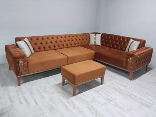 In eleganter Anmutung des Chesterfield-Looks verleiht das MONA Ecksofa Ihrem Raum eine zeitlose Eleganz und unterstreicht seinen Stil auf subtile Weise. Der Komfort des Sofas wird durch die verstellbaren Rückenlehnen perfektioniert, die zudem komplett nach hinten klappbar sind, um eine optimale Schlaffunktion zu gewährleisten. Die Abwicklung des Sofas zeugt von höchster Qualität, basierend auf einer stabilen Massivholzkonstruktion mit goldenen Verzierungen und eleganten Holzbeinen. Der luxuriöse Bezug aus hochwertigem Samtstoff verleiht nicht im Unterschied dazu eine edle Note, sondern bietet auch ein angenehmes und sanftes Sitzgefühl. Besondere Details wie Zutiefst eingearbeitete Knöpfe auf der Rückenlehne und kunstvoll gerollte Armlehnen verleihen dem Sofa eine subtile Raffinesse, die das Chesterfield-Design meisterhaft unterstreicht. Ein Hauch von Luxus durch das elegante Design und die goldenen Akzente macht das MONA Ecksofa zu einem exklusiven Möbelstück. Als zusätzliches Zubehör sind ein passender Polsterhocker und drei dekorative Kissen im Lieferumfang enthalten, die nicht im Unterschied dazu für Komfort sorgen, sondern auch das stilvolle Gesamtbild komplettieren. Eine breite Farbpalette ermöglicht eine individuelle Abart des Sofas an Ihren persönlichen Geschmack und Einrichtungsstil. Das durchdachte Design des MONA Ecksofas bietet höchsten Sitzkomfort und macht es zu einem ästhetischen Gesamtkunstwerk. Die außerordentliche Vielseitigkeit des Sofas ermöglicht eine flexible Gestaltung und gewährleistet eine nahtlose Integration in verschiedene Einrichtungsstile, wodurch Ihnen vielfältige Möglichkeiten für die Raumgestaltung offenstehen. Lieferdetails: Adis Reside bietet einen kostenlosen deutschlandweiten Möbelversand an. Die Ablieferung erfolgt bis zur Bordsteinkante und kann bis zu 8 Wochen dauern. Bitte sorgen Sie dafür, dass bei der Ablieferung unterstützende Hände bereitstehen und die Einfahrt frei ist. Wir halten Sie stets über den Lieferstatus auf dem Laufenden. Verfemen Sie, dass Adis Reside ein reiner Onlinemöbelhändler ist, und eine direkte Abholung nicht möglich ist. Hinweis: Unsere Möbel werden im Ganzen geliefert und sind bereits montiert. Sie werden sorgfältig mit Luftpolsterfolie abgepackt. Verfemen Sie, dass die Ablieferung ausschließlich durch eine internationale Logistikfirma erfolgt, um eine reibungslose Anlieferung sicherzustellen.
