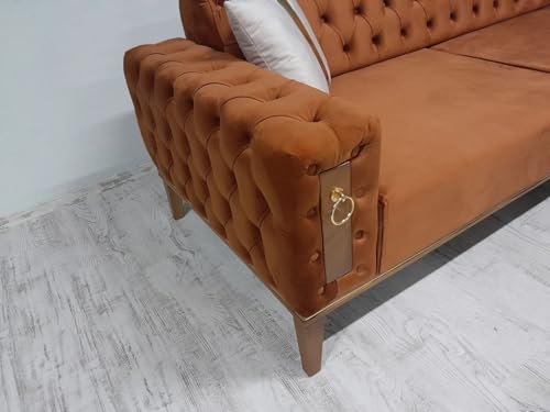 Ecksofa MONA Chesterfield Sofa: Zeitlose Eleganz und Flexibler Komfort · Design: MONA Ecksofa im Chesterfield-Look für zeitlose Eleganz. · Komfort: Verstellbare Rückenlehnen, komplett klappbar für optimale Schlaffunktion. · Abwicklung: Hochwertige Massivholzkonstruktion mit goldenen Details und Holzbeinen. · Material: Hochwertiger Samtstoff-Bezug für luxuriöse Note und angenehmen Sitzkomfort. · Details: Zutiefst eingearbeitete Knöpfe auf der Rückenlehne, kunstvoll gerollte Armlehnen für besondere Raffinesse.