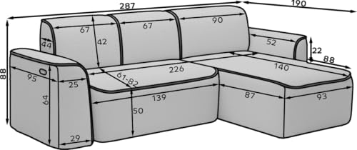 DESIGN: L-förmiges Ecksofa mit eleganter Relaxfunktion, perfekt an Stelle moderne Wohnräume. Gesamtmaße: 287 cm Breite, 190 cm Abgrund, 88 cm Höhe.
