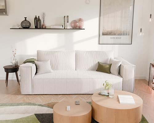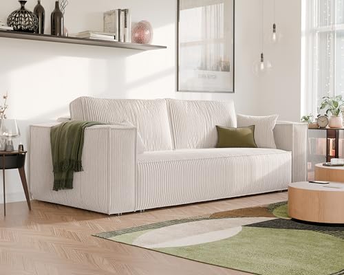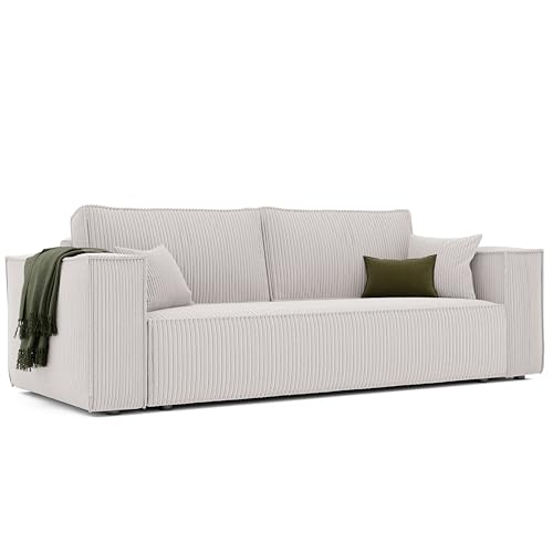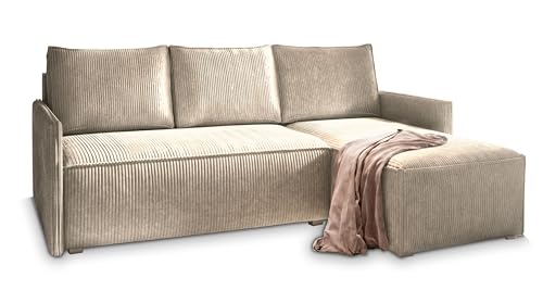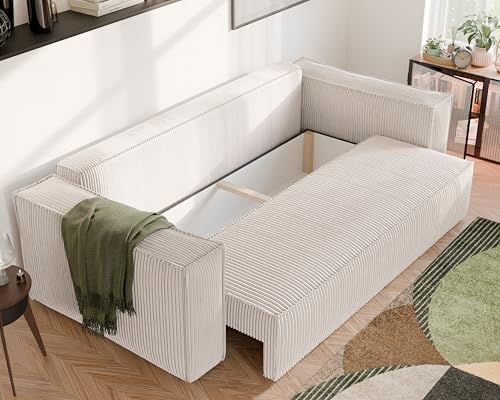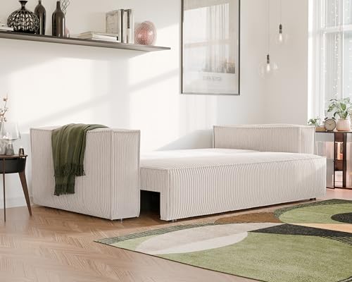 GREKPOL Schlafsofa mit Bettkasten 240×105 – Cord Beige Sofa mit schlaffunktion – Couch mit Schlaffunktion- 3 Sitzer – Wohnzimmer Couch – Schlafcouch