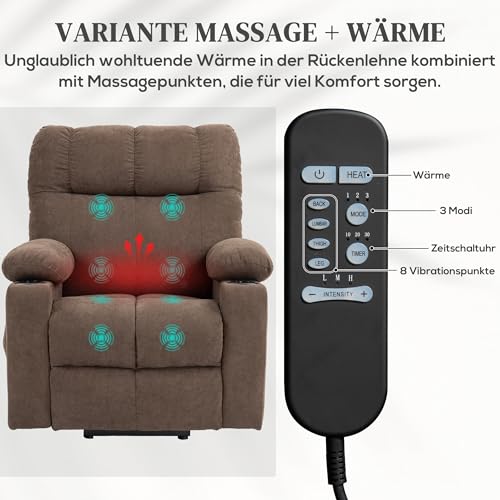 Vibrationsmassage und Wärme: Genießen Sie eine wohltuende Entspannung mit diesem Fernsehsessel, der über drei Modi und acht Vibrationsmassage-Motoren verfügt. Diese zielen auf Rücken, Lendenbereich, Oberschenkel und Beine. Alternative Wärme im Lendenbereich hilft, Muskelverspannungen zu abschwächen. Gebühren Sie was auch immer bequem per Fernbedienung von Ihrem Sitz jeder.