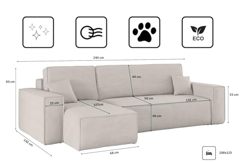 Kaiser Möbel, Ecksofa mit schlaffunktion, mit Bettkasten, Schlafsofa Best, Designer Sofa, Modern Design Couch, Polsterecke, Freistehend, Dicker Cord, Beige Links