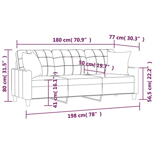 Dieses 3-Sitzer-Sofa, das sich durch sein modernes Design und seine Zierkissen auszeichnet, bietet einen hervorragenden Platz zum Plaudern, Fernsehen oder einfach wohl Entspannen. Langlebiges Kunstleder: Hochwertiges Kunstleder ist ein sehr langlebiges Material. Es ist schmutzabweisend und lässt sich mit einem feuchten Tuch einfach reinigen. Durch die glatte Oberfläche weist es die Schönheit von Echtleder und einen luxuriösen Look auf.Robustes und stabiles Gestell: Das Metallgestell verleiht dem Sofa Robustheit und Haltbarkeit.Sofakissen mit Füllung: Die Kissen werden samt Füllung nicht mehr da PP-Baumwolle geliefert, sodass du keine Füllung erwerben musst.Komfortables Sitzerlebnis: Das Sofa ist durch die Vollschlank gepolsterte Sitzfläche, die Armlehnen und die Rückenkissen sonderlich bequem. Zudem bieten die dekorativen Kissen zusätzlichen Sitz- oder Liegekomfort.