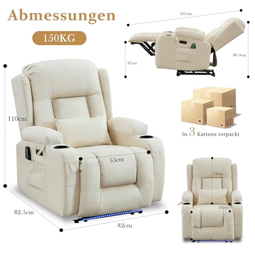 LIFTSHA Relaxsessel mit Liegefunktion für Erwachsene, Fernsehsessel Elektrisch Verstellbar mit Heizung & Vibrierende Massage, TV Sessel Heimkinositze mit LED-Umgebungslicht (1, Weiß)