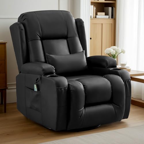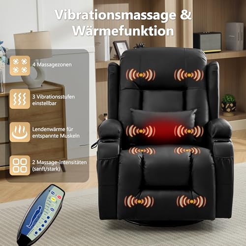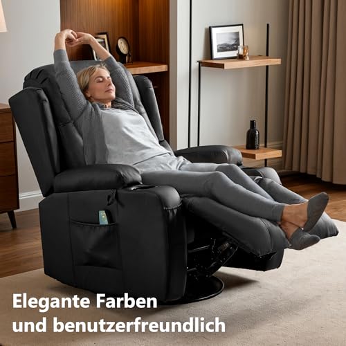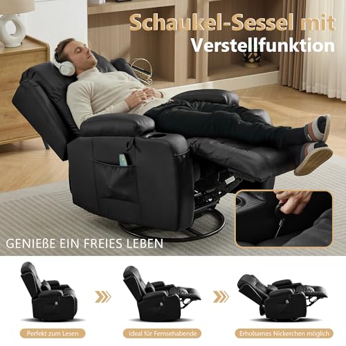 LIFTSHA Relaxsessel mit Liegefunktion, Massagesessel mit Wärmefunktion, 360° Drehbarer Fernsehsessel Wohnzimmer, Schaukelstuhl mit Kissen/Seitentaschen/Getränkehalter (Schwarz)
