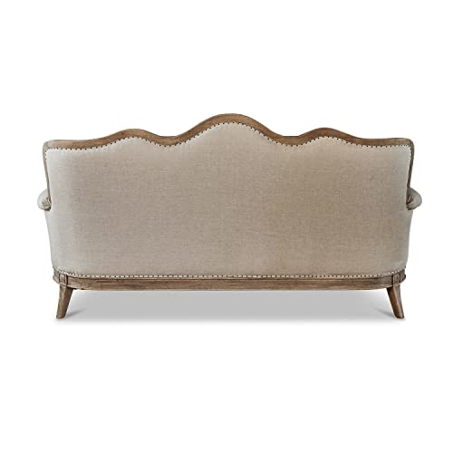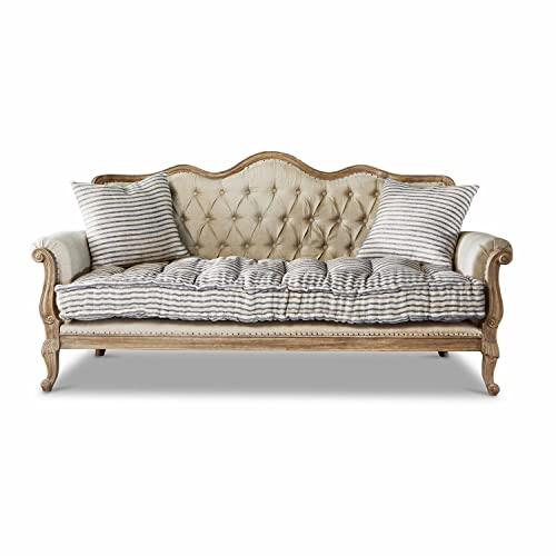 Ein Klassiker im französischen Landhaus-Stil. Traditionell gefertigt mit Chesterfield-Steppung und elegant geschwungenem Gestell aus edlem Mangoholz. Hochwertiger Bezug aus reinem Leinen. Sofas gibt es viele, dagegen hier zeigen wir Ihnen eine Kreation, wie es nicht viele gibt. Seine Entstehungsgeschichte könnte man alias als eine Zeitreise durch vergangene Epochen bezeichnen, denn für dieses Sofa hat sich der Designer mal hier, mal da bedient. Der kunstvoll geschwungene, von Hand verzierte Rahmen und die stilecht gearbeiteten Füße aus edlem Mangoholz erinnern an die Sitzmöbel des französischen Rokokos, während die rautenförmige Steppung ganz eindeutig bei den englischen Chesterfield-Sitzmöbeln entlehnt wurde. Der Bezug aus reinem Leinen von neuem ist ein klassisches Stilelement des traditionellen Landhaus-Looks, der bei diesem Sofa mit dem Mix aus Unifarbton und feinen Streifen eine moderne Schreiben ins Spiel bringt. Aus diesen Zutaten komponierte der Künstler ein Sofa, das in jedem Universum zum bewunderten Highlight werden wird. Und Ihnen zugleich Abend für Abend als stilvolle Entspannungsinsel dient. Was in früheren Epochen verpönt war, dürfen Sie hier und gegenwärtig nach Herzenslust tun: sich gemütlich hineinlümmeln, die Füße hochnehmen, in die zwei Zierkissen kuscheln und, und, und.