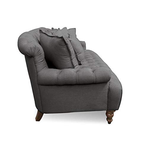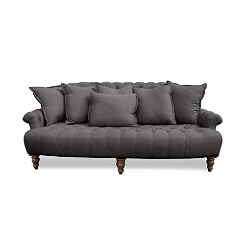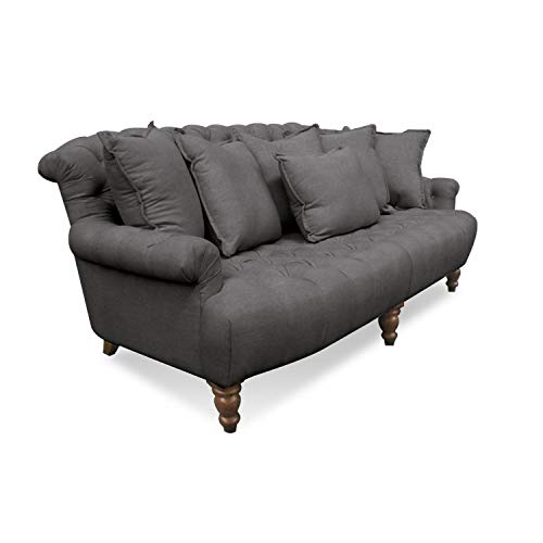 Vorne liebevoll gedrechselt Beine. Der hochwertige Bezug mit Leinen-Teilzahlung bespannt dieses edle Sofa im klassischen Chesterfield-Design. Mit sechs hübschen Zierkissen ergibt sich eine reizende Wohlfühloase. Hohes Kuschelpotential durch die sechs separaten Kissen. Stabiles Holzgrundgestell, die fünf Beine, vorne liebevoll gedrechselt, geben Konstanz. Feste, komfortable Schaumstoffpolsterung.