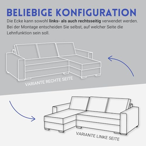 ✔ Universalsofa – Seitenwahl bei der Möbelmontage; Beim Zusammenbau des Sofas entscheidet der Benutzer, ob er die Ottomane rechts oder links in der Ecke platziert.