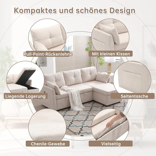 Das flexible Design des Ecksofas ermöglicht es, die linke und rechte Seite nach Ihren Wünschen auszutauschen.Das praktische Stauraum-Design bietet reich Platz unter dem Liegesitz, ideal zur Aufbewahrung von Bettwäsche, Kissen oder saisonaler Kleidung. So bleibt Ihr Zimmer stets hübsch und aufgeräumt. Zudem sind seitliche Ablagefächer integriert, um Fernbedienungen und andere kleine Gegenstände griffbereit zu halten.