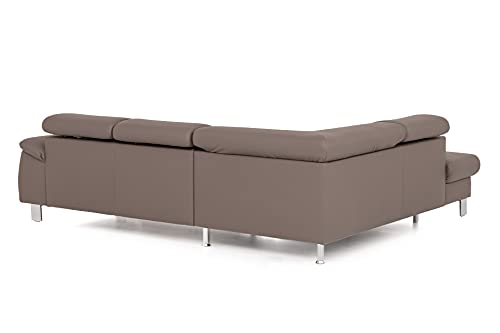 Moderne Eckcouch fürs Wohnzimmer, mit Ottomane, Bettfunktion (echt), kleinem Bettkasten und drei verstellbaren Kopfstützen (7-stufig)