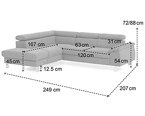 Moderne Eckcouch fürs Wohnzimmer, per Ottomane, Bettfunktion (WAHR), kleinem Bettkasten ebenso drei verstellbaren Kopfstützen (7-abgestuft)