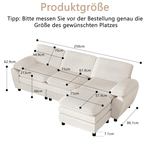 【Individuelles Design & Anpassungsfähigkeit】 Dieses modulare Sofa kombiniert drei Sitzelemente und einen abnehmbaren Hocker (71×57,9×62,9 cm), der als Fußbank, Zusatzsitz oder Loungemodul dient. Arrangieren Sie Ihr Wohnzimmer als L-Form, Doppelsofa oder mit separatem Ottomane – ideal für kleine Räume oder offene Wohnkonzepte. Die höhenverstellbaren Füße (7,1 cm) passen sich jedem Bodenbelag an.