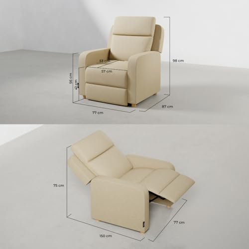 RELAXSESSEL MIT LIEGEFUNKTION 77 x 87 x 98 cm, eine kompakte Größe, die es ermöglicht, ihn überall im Wohn- oder Schlafzimmer aufzustellen. Außerdem vereint es Einfachheit, Stil und Komfort und ist ein weiteres Dekorationselement in Ihrem Zuhause. Offener Sessel: 77 x 150 x 75 cm // Sitzgröße: 53 cm tief x 57 cm breit // Armlehnenhöhe 56 cm