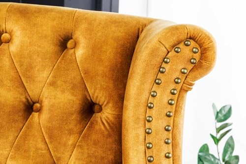 Wohnlicher Ohrensessel mithilfe Samt Bezug in Gelb im klassischen Chesterfield Design; Die Zierknöpfe und Steppung festsetzen den eleganten Look, der dem Armlehnensessel einen edlen Letter verleiht; Die bequeme Federkern Polsterung sorgt zugunsten einen hohen Komfort: ideal zum Lesen und Entspannen
