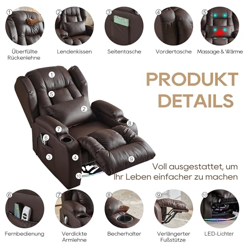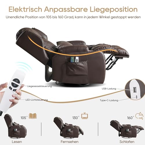 Oprisen Elektrisch Verstellbar Relaxsessel Kinosessel Fernsehsessel mit Liegefunktion Massage und Wärme TV Sessel Drehbar Liegesessel Sofa mit USB/LED/TYP C für Wohnzimmer,bis 150 kg (PU Braun)