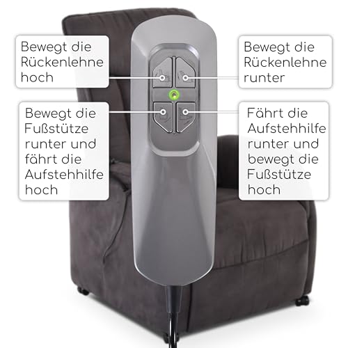 ✅ Erlebe müheloses Aufstehen mit unserer elektrischen Aufstehhilfe: Der TV-Sessel unterstützt dich beim sicheren und mühelosen Aufstehen. Die elektrische Aufstehhilfe hebt den Sessel langsam und leise an, sodass du ohne Anstrengung aufstehen kannst. Der Sessel hat eine Breite von 77 cm, eine Höhe von 113,5 cm (142 cm mit Aufstehhilfe oben) und eine Abgrund von 79 cm (154 cm in Liegeposition).