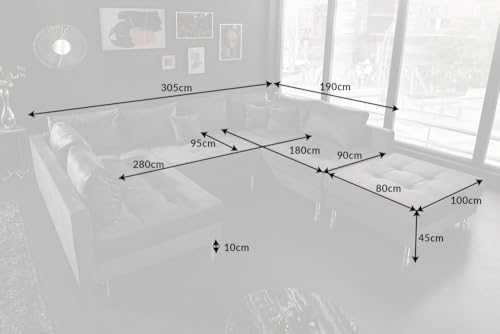 Abmessungen B x H x T: 305 x 85 x 190 cm // Sitzbreite: 280 cm (mit Kissen: 235 cm) // Sitzhöhe: 45 cm // Sitztiefe: 95 cm (mit Kissen: 75 cm) // Höhe Rückenlehne: 40 cm // Ottomane B x T: 90 x 180 cm // Hocker B x H x T: 100 x 45 x 80 cm // Kleines Kissen B x H: 30 x 30 cm (3x) // Großes Kissen B x H: 60 x 40 cm (8x) // Höhe Füße: 10 cm // max. Belastbarkeit: 180kg