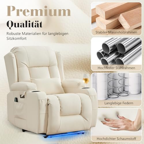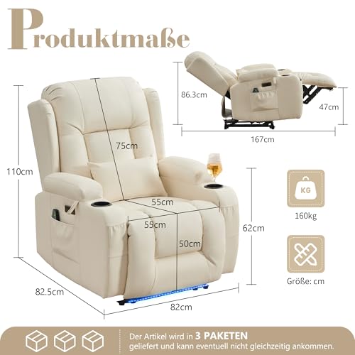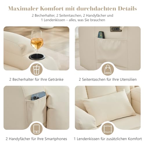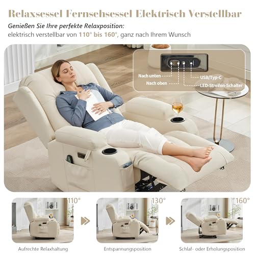 SAMERY Fernsehsessel Elektrisch Verstellbar Relaxsessel mit Liegefunktion,Massagesessel Vibration Heizung,Kunstleder TV Sessel Wohnzimmer Liegesessel Kinosessel 614 mit USB/LED,bis 150 kg (3, Beige)