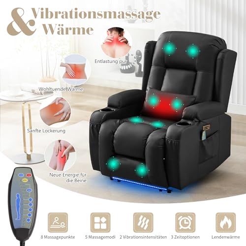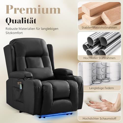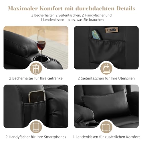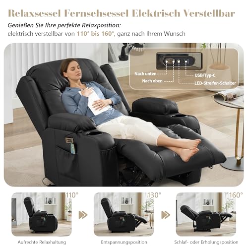 SAMERY Fernsehsessel Elektrisch Verstellbar Relaxsessel mit Liegefunktion,Massagesessel Vibration Heizung,Kunstleder TV Sessel Wohnzimmer Liegesessel Kinosessel 614 mit USB/LED,bis 150 kg (3, Schwarz)