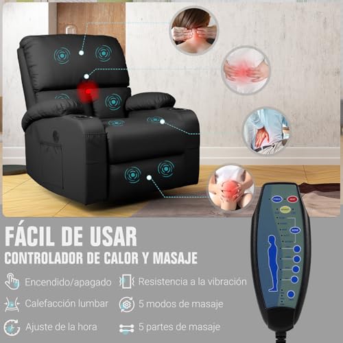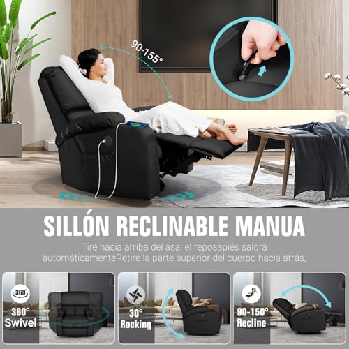 Schaukelstuhl mit Relaxfunktion, Massagesessel mit Vibration und Wärme, USB- und Type-C-Anschlüsse, 360° drehbare Kunstledersessel, Wohnzimmer, Schlafzimmer, Kinderzimmer, Wohnmobil, Schwarz