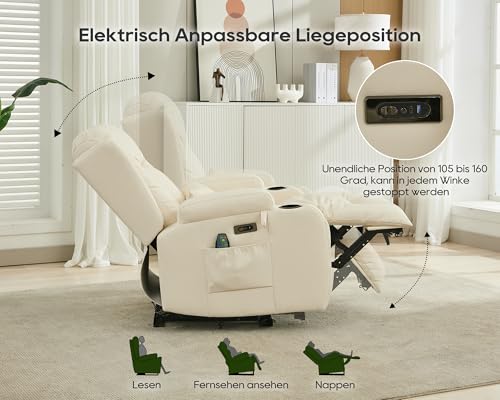 Elektrisch Relaxsessel mit Liegefunktion Fußteil: Nicht mehr da TV-Sessel kann elektrisch von 105° bis 160° geneigt werden. Die ausziehbare Fußstütze ermöglicht eine vollständige Streckung der Beine. Ideal zum Lesen, Fernsehen oder anstatt ein Nickerchen