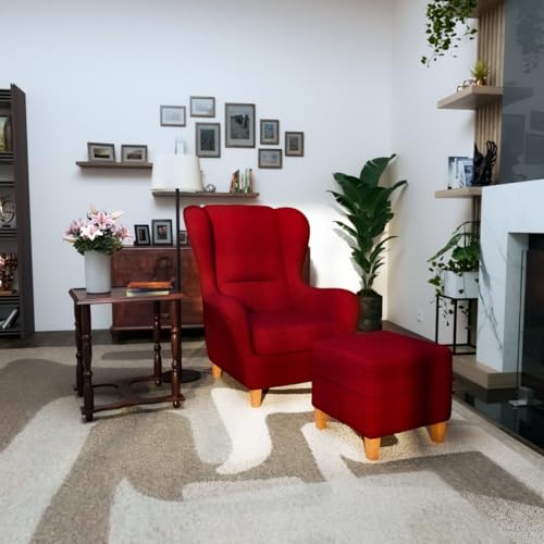 Supellex Sofia Ohrensessel mit Hocker, Sessel Wohnzimmer, Stil Relaxsessel, Hohe Rückenlehne, moderner Fernsehsessel, Loungesessel, Polstersessel, Design Vienna Rubin-Rot