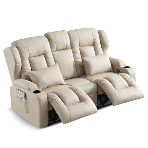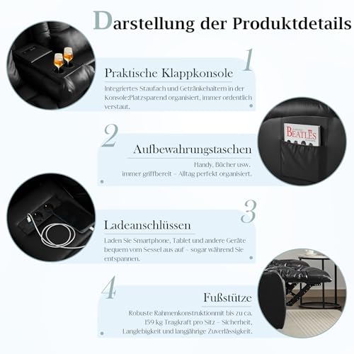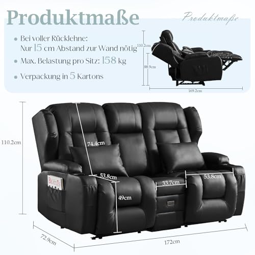 Dieses Zweisitzer-Liegesofa vereint minimalistisches Design mit praktischen Funktionen – individuelle Verstellung, robuste Materialien, cleverer Stauraum und hohe Tragkraft. Perfekt für Entspannung, Filmabende oder Lesestunden in Wohnzimmer, Schlafzimmer, Balkon oder Wohnmobil. Eine komfortable und platzsparende Auftrennung für modernen Wohnkomfort! Manuell verstellbare geteilte Rückenlehne: Mittels Zugringen lässt sich die Lehne stufenlos von 90° bis 160° zurückneigen. Beide Sitze können abgekoppelt voneinander zwischen Sitzposition, Halbliege- und Vollliegeposition eingestellt werden – ideal für Lesen, Fernsehen, Gaming oder entspanntes Schlummern. Multifunktionales Design: Integrierte Getränkehalter, seitliche Stauertaschen und versteckter Stauraum bieten Platz für Bücher, Zeitschriften, Fernbedienungen und Smartphones. Alles stets griffbereit! Platzsparende Konstruktion: Der Schlafsessel benötigt wohl 15 cm (6 Gebühr) Wandabstand zum vollständigen Zurücklehnen. Perfekt für beengte Räume – ob Wohnzimmer, Schlafzimmer, Wohnmobil oder Heimkino. Luxuriöses und pflegeleichtes Material: Hochwertiges, wasser- und schmutzabweisendes Kunstleder kombiniert edle Optik mit praktischer Alltagstauglichkeit. Selbst Kaffeeflecken lassen sich mühelos loslösen. Stabile Langlebigkeit: Robuster Stahlrahmen mit Massivholzverstärkung garantiert sicheren Halt und eine maximale Belastbarkeit von 160 kg (350 Pfund) pro Sitzplatz – für jahrelangen Komfort. Vom flexiblen Verstellmechanismus bis zu robusten Details – dieses Relaxsofa vereint minimalistischen Komfort mit cleverer Funktionalität. Ob Filmabend zu zweit, Lesestunde allein oder Nickerchen auf dem Fernsehsessel: Unabhängige Verstellung, praktischer Stauraum und stabile Tragkraft Acht geben Entspannung. Platzsparend und alltagstauglich – die perfekte Wahlgang für kleine Wohnungen und praktische Haushalte!