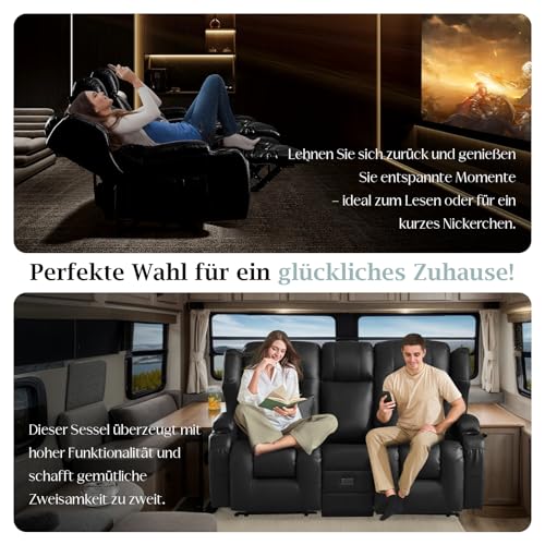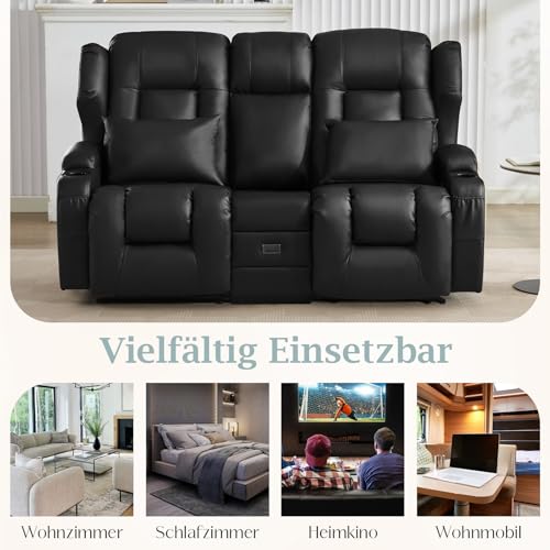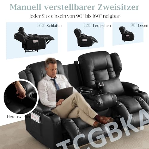 TCGBKAF Kinosessel 2 Sitzer Relaxsessel Fernsehsessel mit Liegefunktion,Kunstleder Fernsehsessel Verstellbar 2er Relaxsofa mit Klappkonsole, 2 Sitzer TV Sessel Liegesessel Wohnzimmer, Schwarz