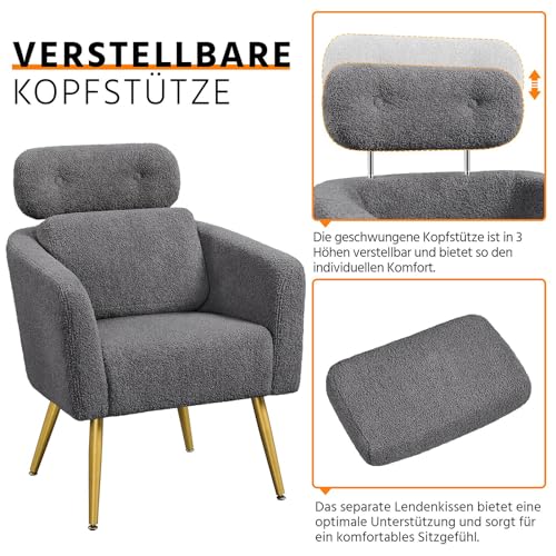 Yaheetech Loungesessel aus Bouclé-Gewebe Sessel Polstersessel mit höhenverstellbarer Kopfstütze Fernsehsessel mit Metallbeinen für Wohnzimmer/Büro Dunkelgrau